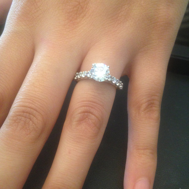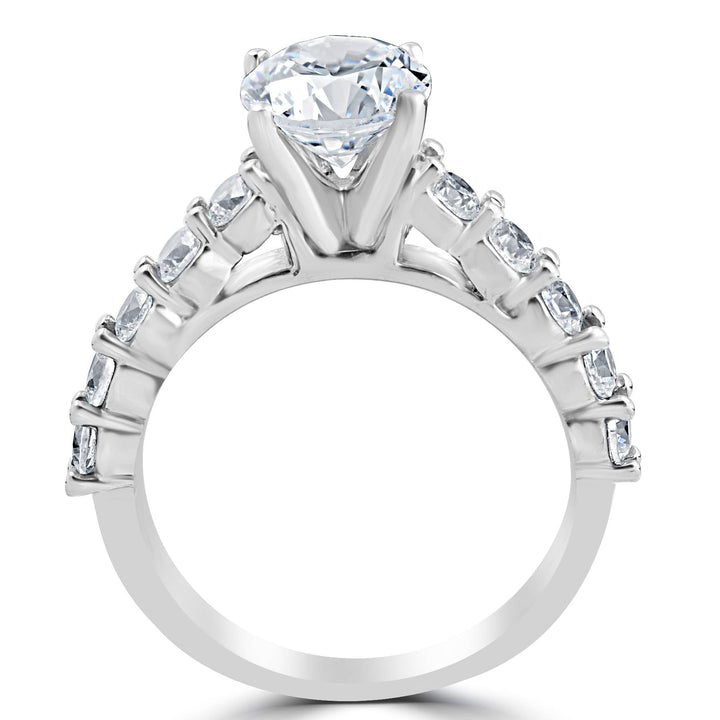 This 2 Carat Round Cut Solitaire Engagement Ring by Pompeii3 is the ultimate expression of elegance and devotion. A clarity-enhanced 1.5ct diamond is showcased with ten sparkling accent stones, all set in lustrous 14k white gold — a bold, timeless declaration of love.