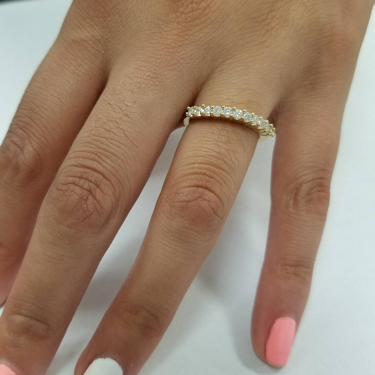 This 1/2ct Diamond Wedding Ring by Pompeii3 radiates classic beauty. Eleven sparkling round diamonds are prong-set in rich yellow gold, creating a thick and elegant band that’s perfect for celebrating enduring love.