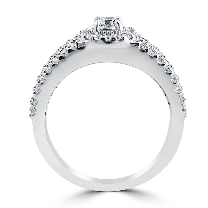 This 1 Carat Vintage Halo Diamond Engagement Wedding Ring Set by Pompeii3 radiates classic glamour. Featuring a 1/4ct center stone surrounded by a shimmering halo and 71 diamonds, this set is designed for timeless beauty and sparkle.