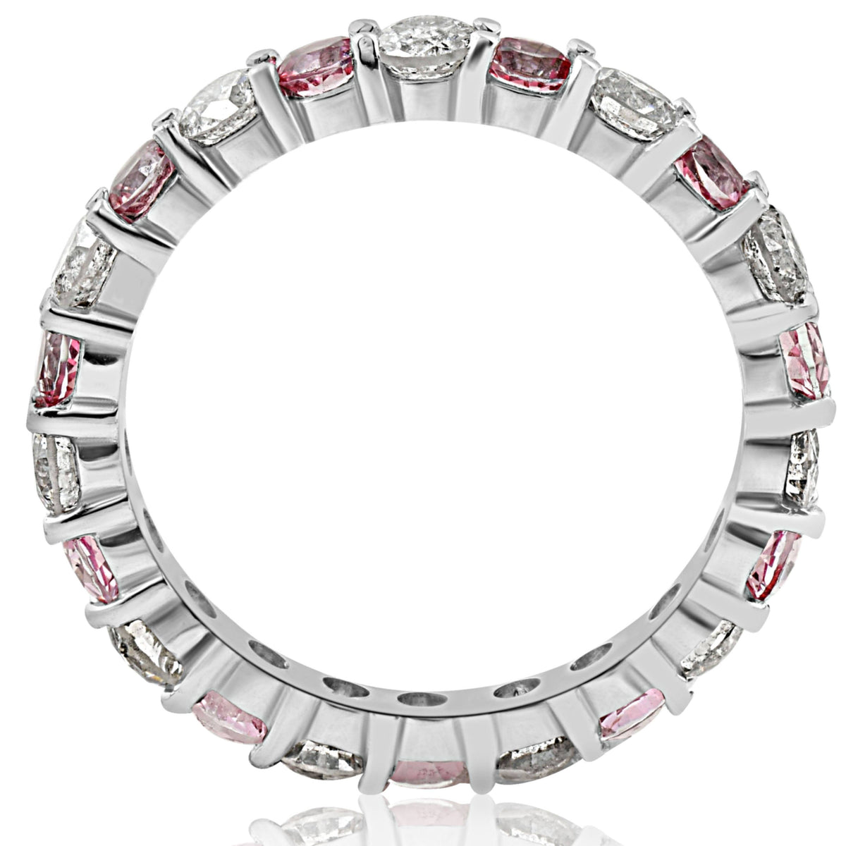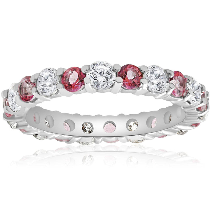 This 2ct Diamond & Pink Topaz Eternity Ring by Pompeii3 is a vibrant and romantic design. Alternating sparkling diamonds and vivid pink topaz stones are set in lustrous 14k white gold, symbolizing passion and unity.