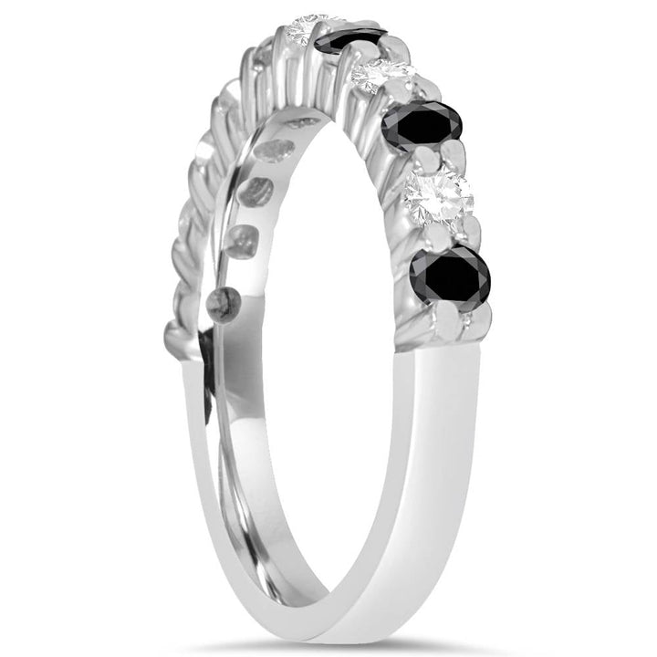 This 5/8CT Black & White Diamond Wedding Ring by Pompeii3 offers bold contrast and refined sparkle. Featuring six black diamonds and five white diamonds prong-set in luminous 14k white gold, it’s a modern twist on classic romance.