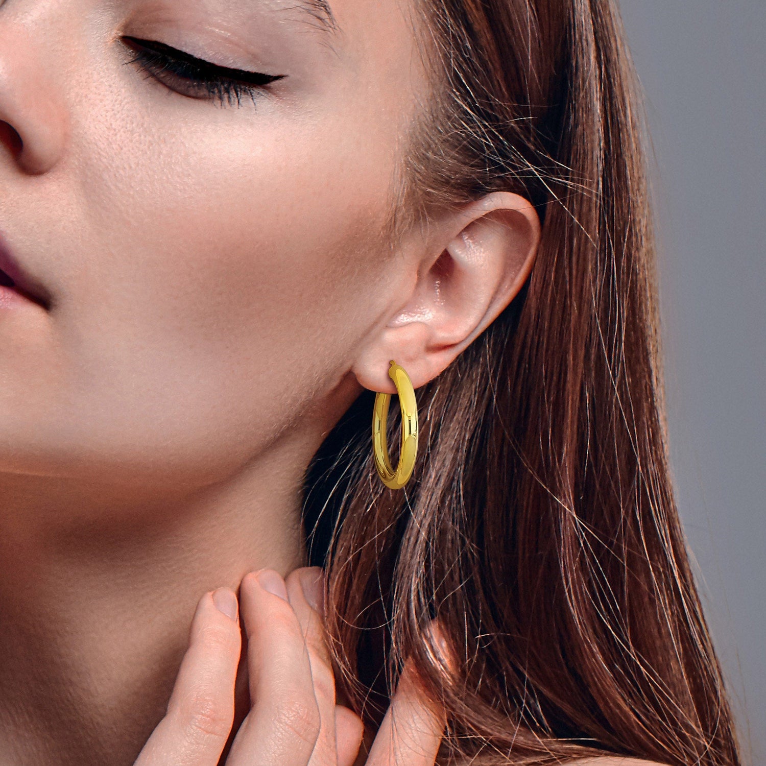 Made of 14K yellow gold. Earring diameter: 15mm, width: 1mm.
