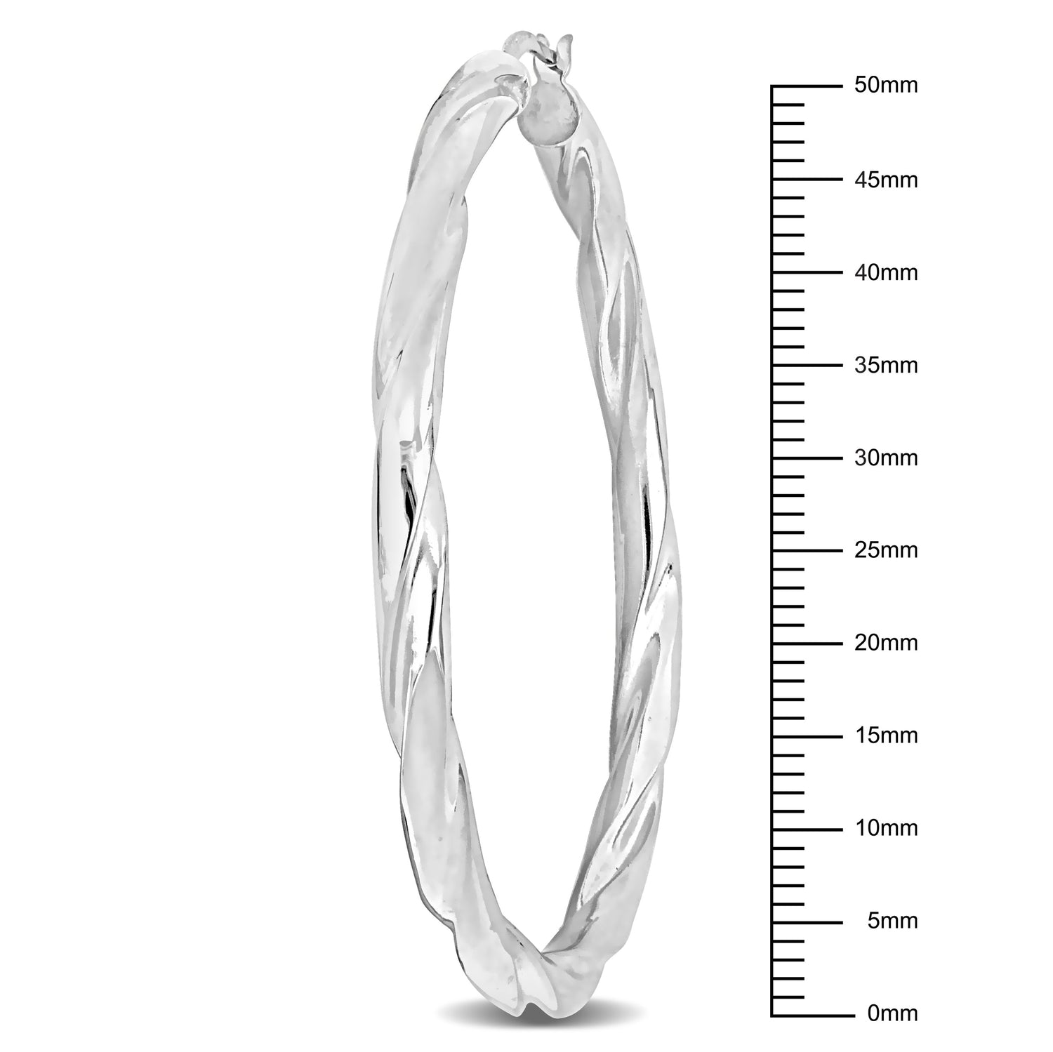 Made from sterling silver, measuring 58mm in diameter and 4mm wide. Lightweight with a polished twist design and secure latch backs.