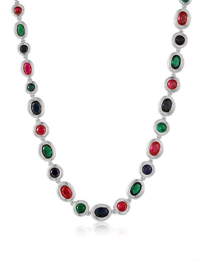 The Royale Stone Tennis Necklace by Luv Aj is a playful and luxurious statement piece. Featuring a row of bezel-set navy, dark green, and pink cubic zirconia stones, the design is finished with a sleek magnetic closure for effortless wear. This bold yet refined necklace is perfect for adding color and sparkle to any look.
