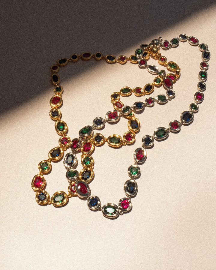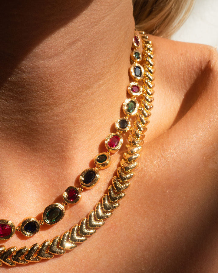 Made from brass with gold or silver plating. Features bezel-set CZ stones in navy, dark green, and pink. Necklace measures 17" long, weighs approximately 38g, with a magnetic closure. Nickel-free and cadmium-free. Comes in Luv Aj branded gift boxes.