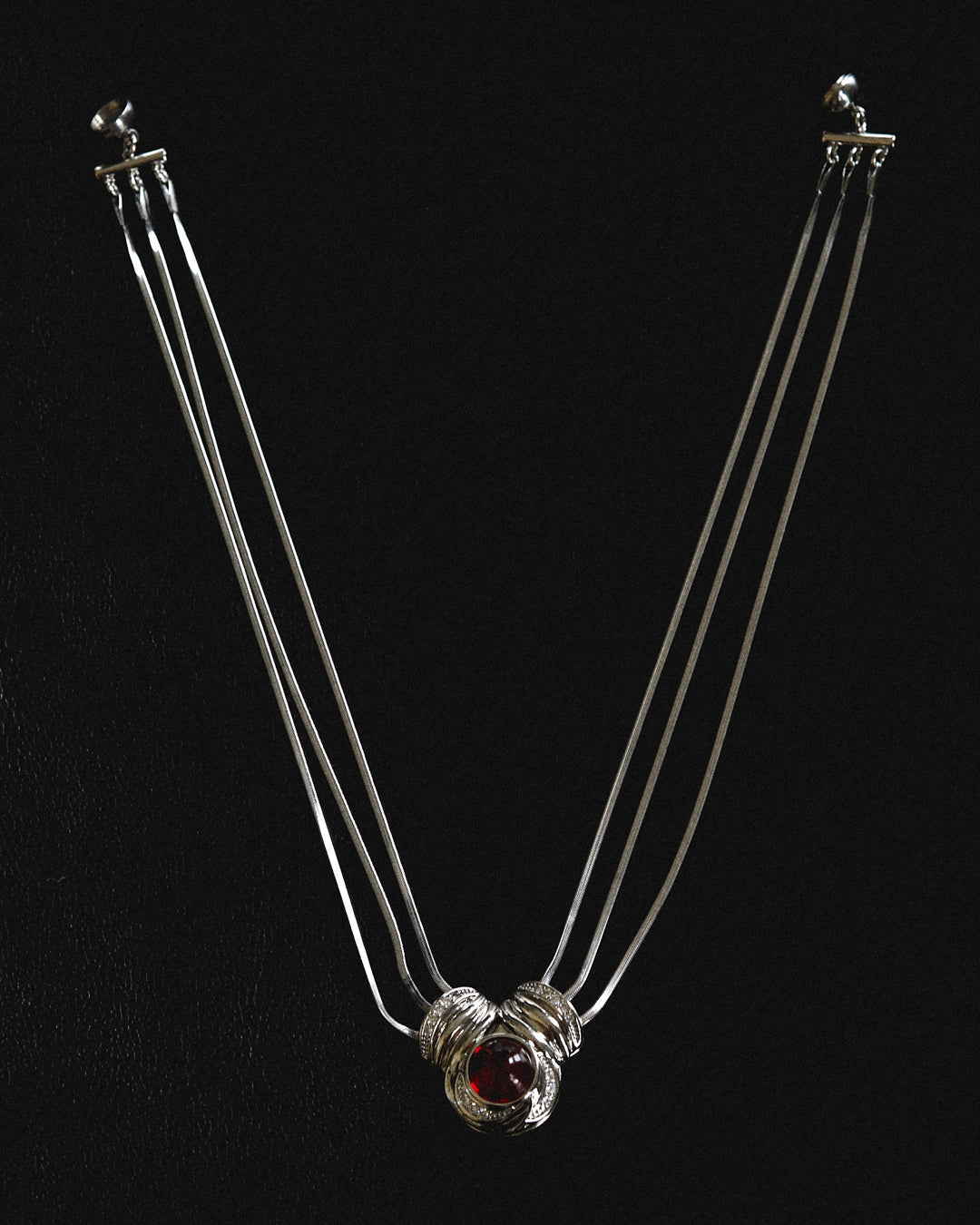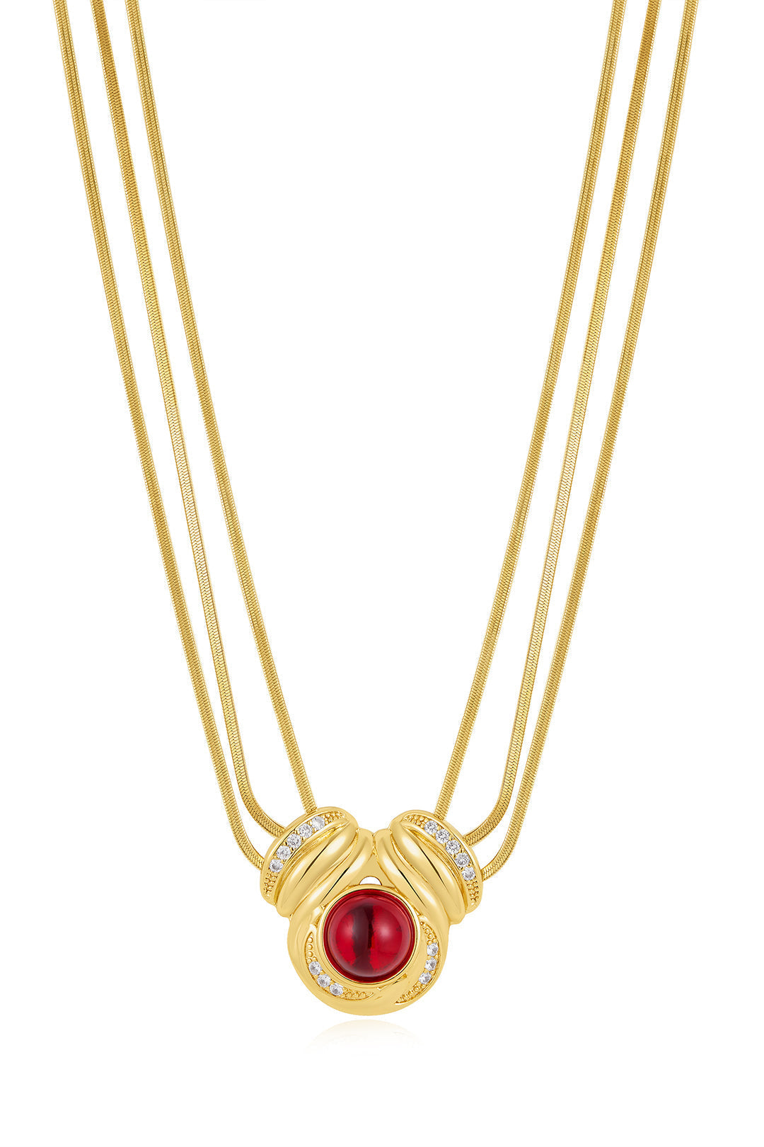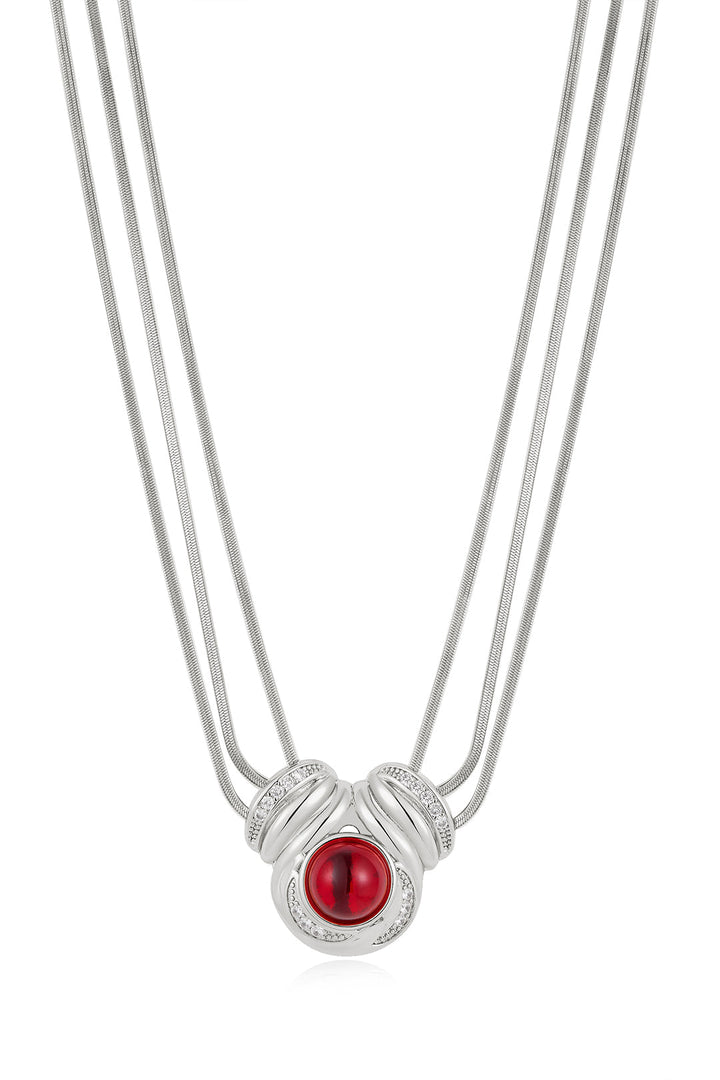 The Shiraz Pendant Necklace by Luv Aj makes a bold, luxurious statement with three sleek snake chains and a dramatic center pendant featuring CZ stones and a rich red cabochon. Finished with a magnetic clasp, this necklace is part of the exclusive Camelia Farhoodi x Luv Aj Collection — designed to captivate.