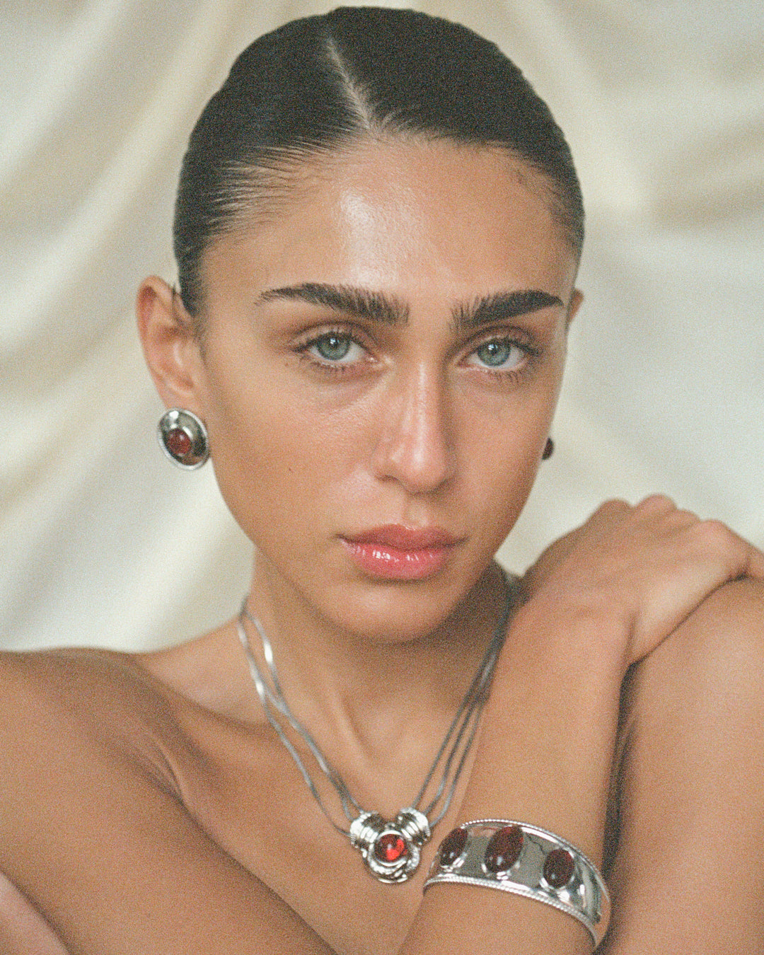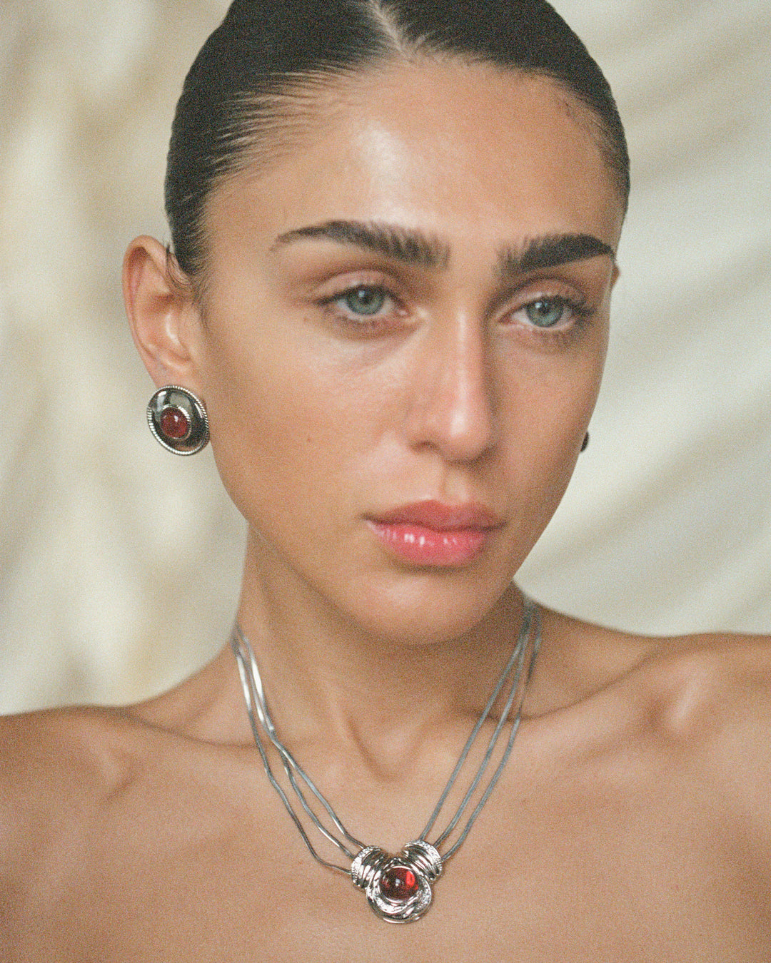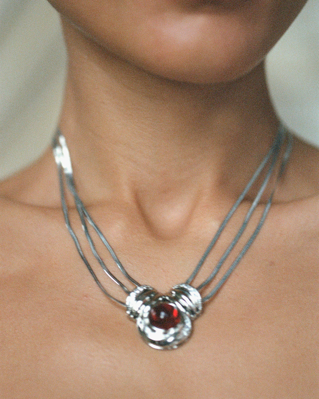 The Shiraz Pendant Necklace by Luv Aj makes a bold, luxurious statement with three sleek snake chains and a dramatic center pendant featuring CZ stones and a rich red cabochon. Finished with a magnetic clasp, this necklace is part of the exclusive Camelia Farhoodi x Luv Aj Collection — designed to captivate.