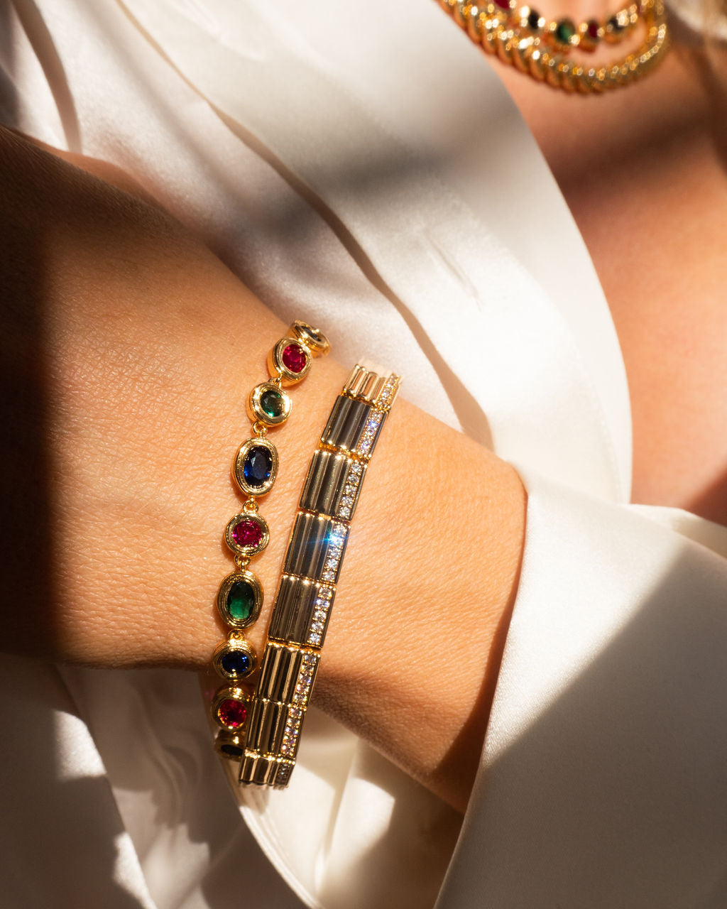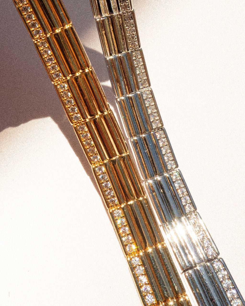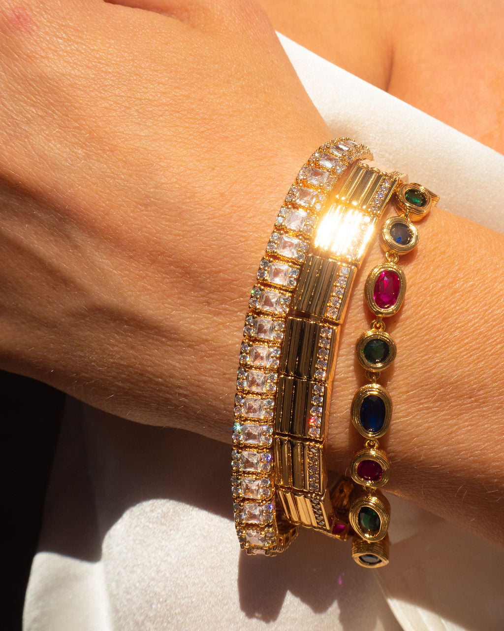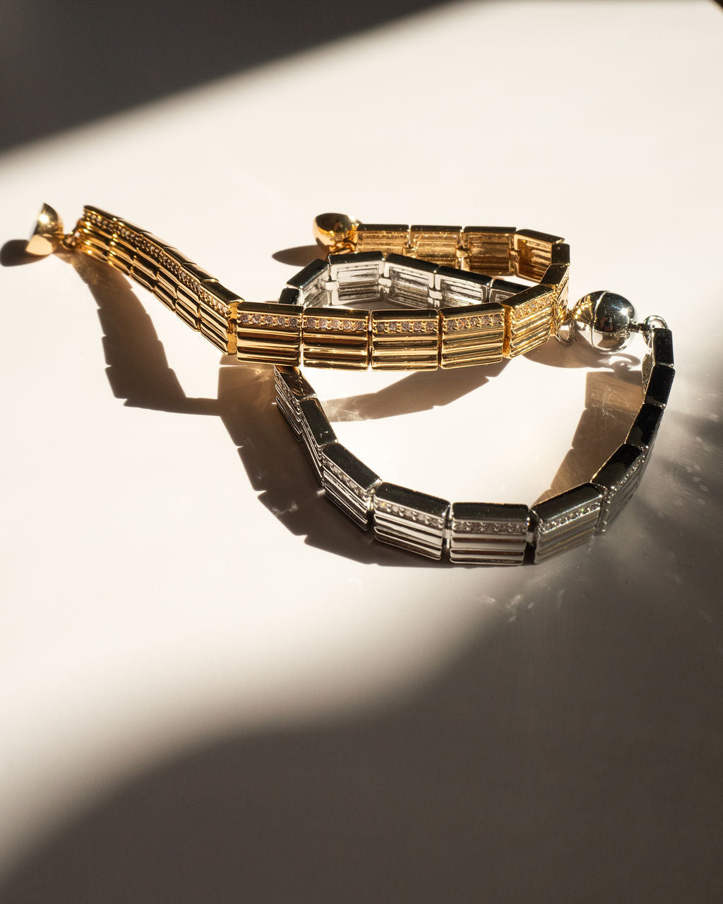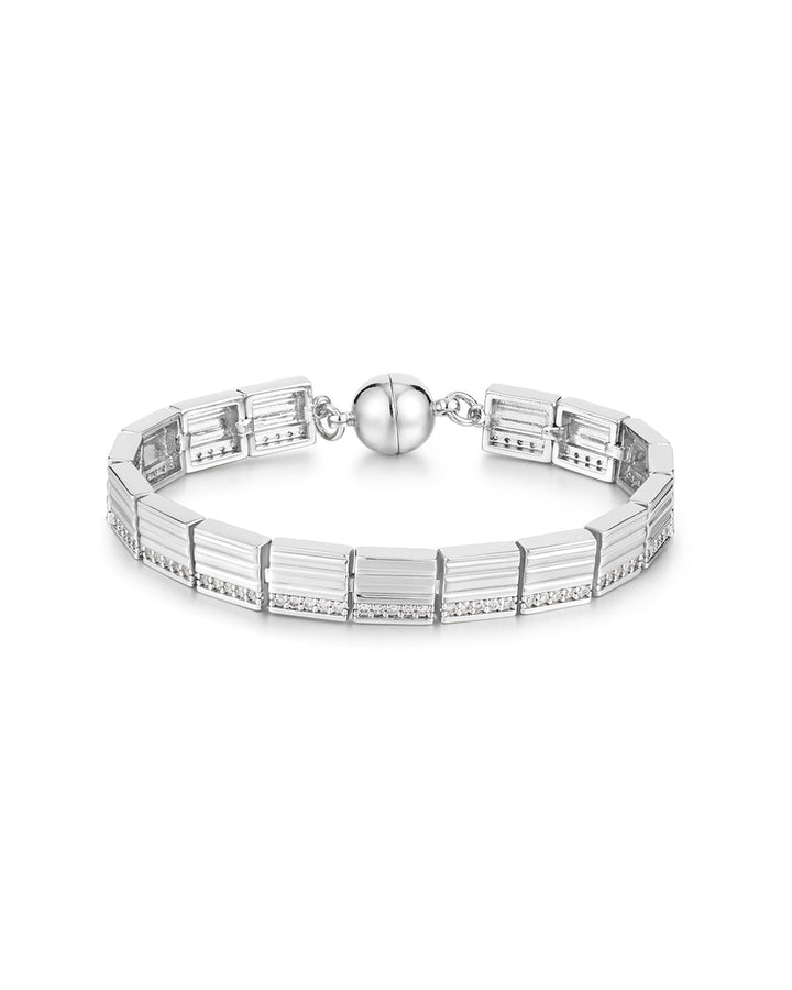 Crafted from brass, plated in gold or silver, featuring pave CZ stones. Measures 7.5' in length and 8mm in width. Weighs 21.7g. Magnetic closure for secure wear.