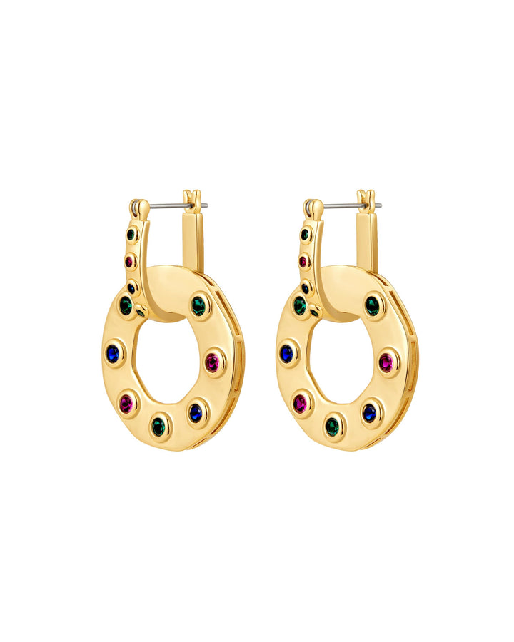 Made from brass with gold or silver plating and colored cubic zirconia stones. Posts made from hypoallergenic surgical steel. Earrings measure 40mm x 27.5mm and weigh 20g. Push back closure, nickel-free and cadmium-free. Packaged in branded gift boxes.