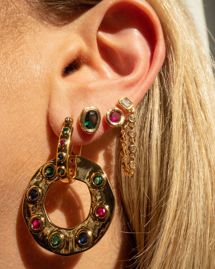 The Royale Stone Statement Earrings by Luv Aj are bold and glamorous, designed to turn heads with their hammered metal finish and vibrant bezeled colored CZ stones. Their oversized design adds a fashion-forward edge to any look.