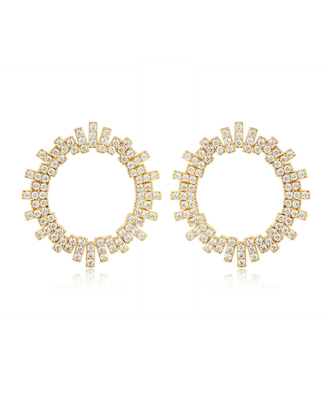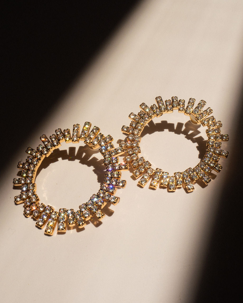 The Pave Ray Earrings by Luv Aj are statement stud earrings that feature a round shape with different rectangular CZ charms. These earrings are sold as a pair and are perfect for those looking for a bold and modern look. The earrings come with a push-back closure for secure wear. Ideal for adding an extra touch of elegance to any outfit, these earrings combine contemporary design with high-quality materials.