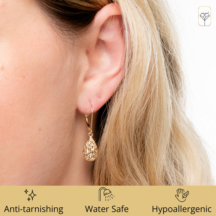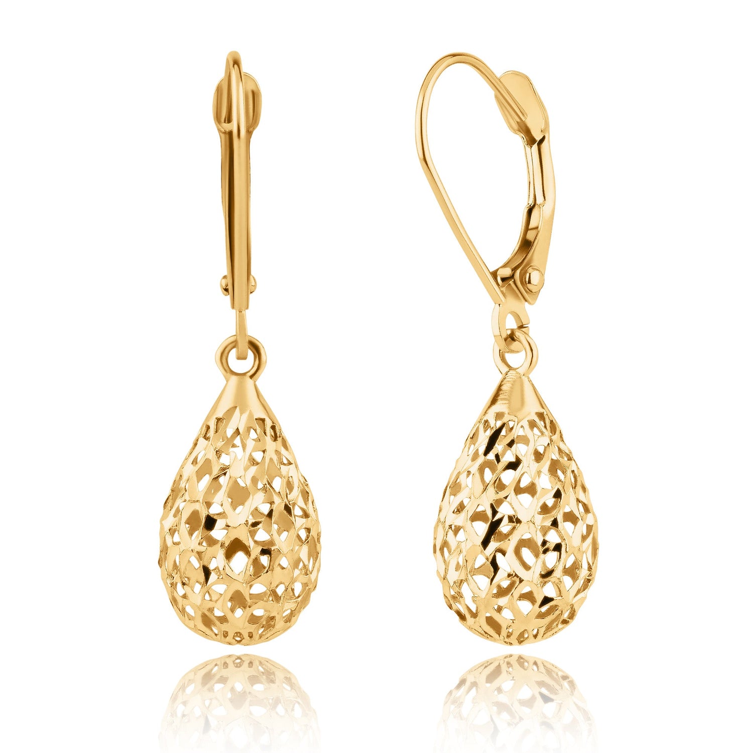Crafted in 14K solid yellow gold, featuring a filigree teardrop design with leverback closure.