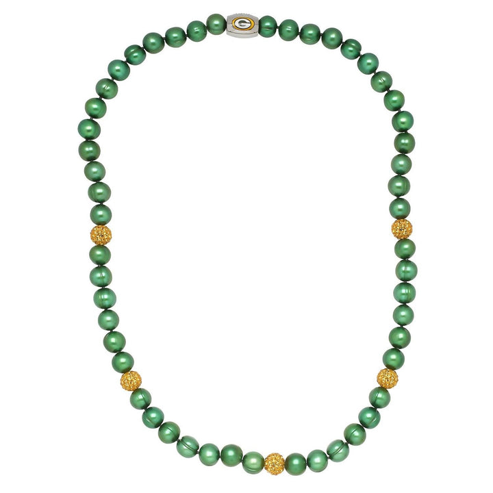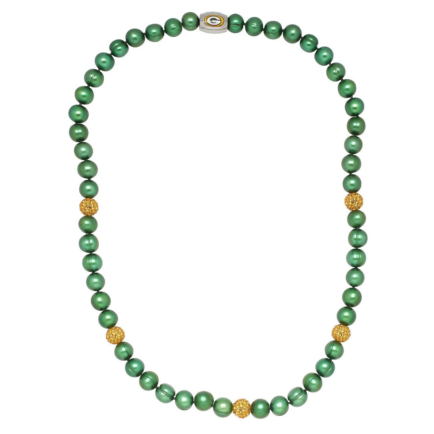 Green Bay Packers logo, pearls, crystal stones, 18-inch necklace, magnetic closure.