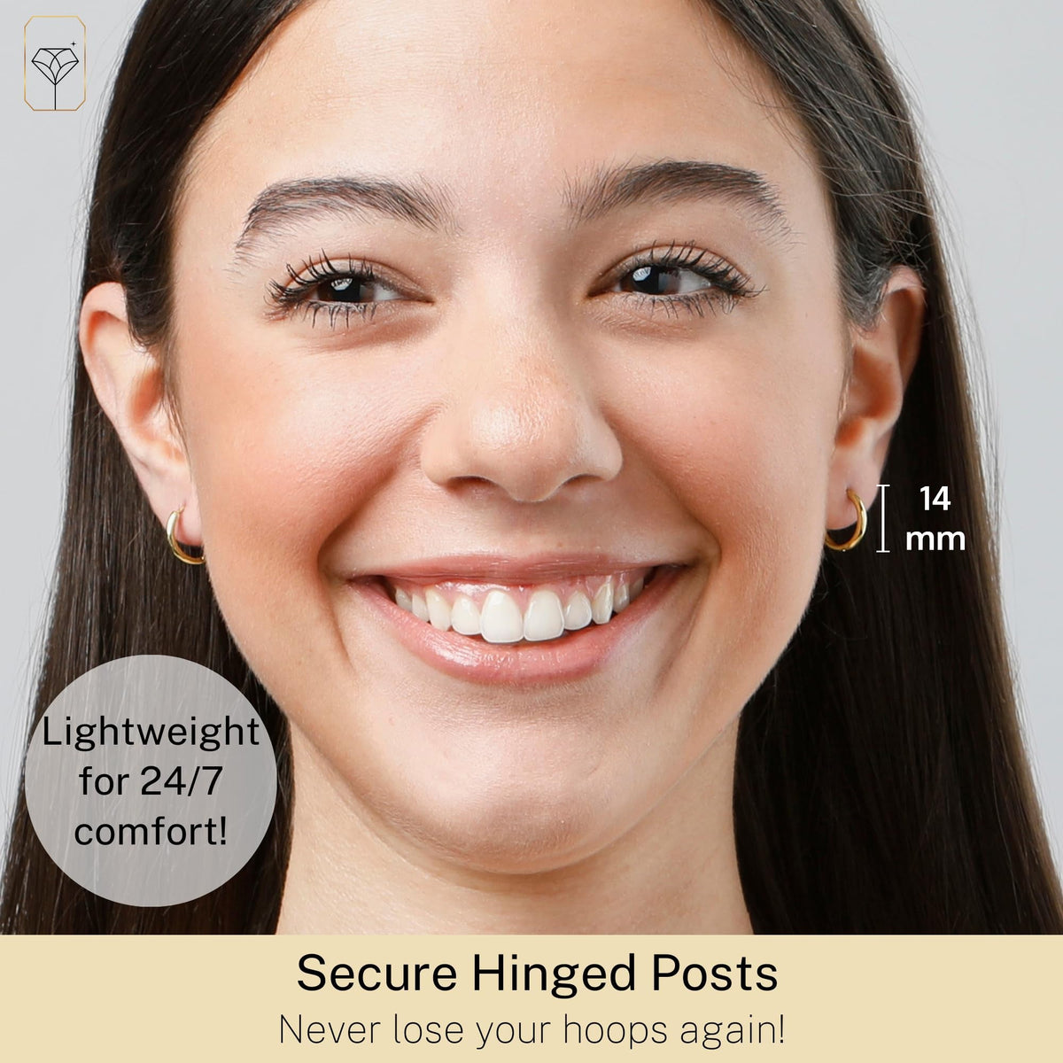 Crafted from solid 14k yellow gold, measuring 14mm in diameter, with hidden post hinged closures.
