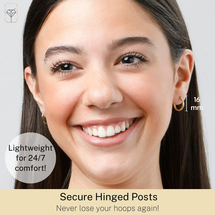 Crafted in solid 14k yellow gold, measuring 16mm in diameter, featuring hidden post hinged closures.