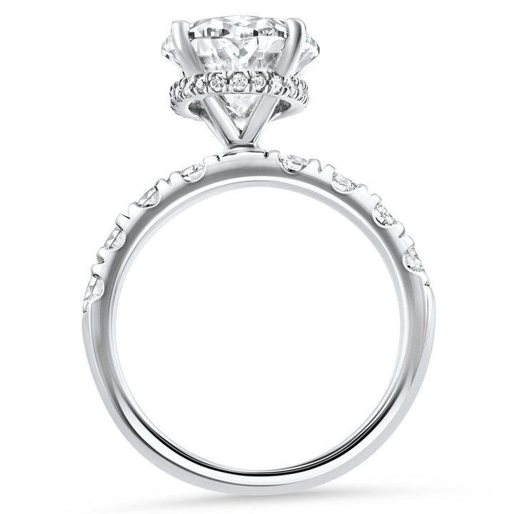 This Certified 5.28ct Oval Diamond Side Halo Engagement Ring by Pompeii3 radiates grandeur and brilliance. The 4.50ct certified oval lab-grown diamond is enhanced by a side halo and set in polished white gold for an unforgettable statement piece.
