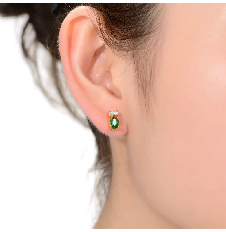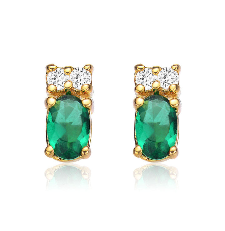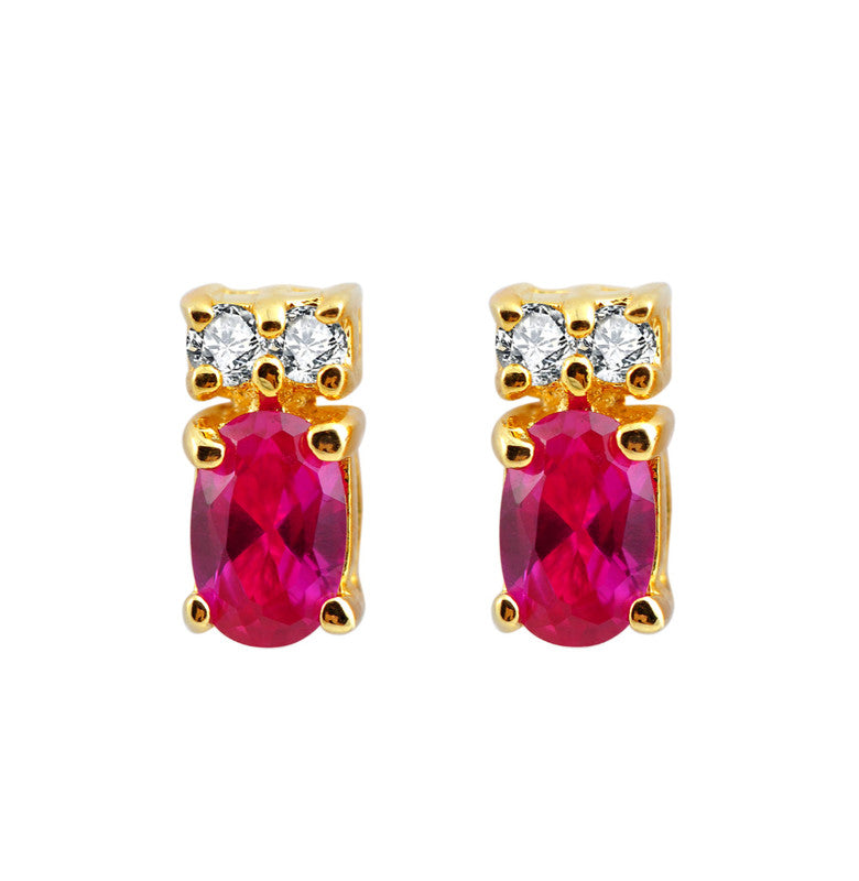 Crafted in 14k gold-plated sterling silver, featuring 8mm emerald green or ruby red cubic zirconia stones. Butterfly clasp backings.