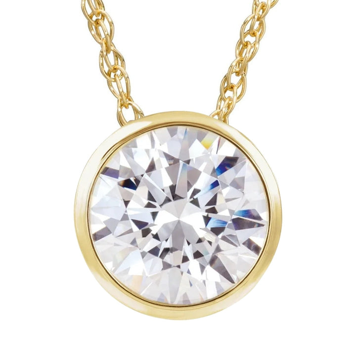 This VS 1 Ct Solitaire Lab Grown Diamond Pendant Necklace by Pompeii3 features a large 1 ct round brilliant-cut EX3 lab-grown diamond. The diamond is flush bezel set in solid 14k white or yellow gold, making it a sophisticated and sustainable choice. The pendant slides on an 18' chain with a spring lock.