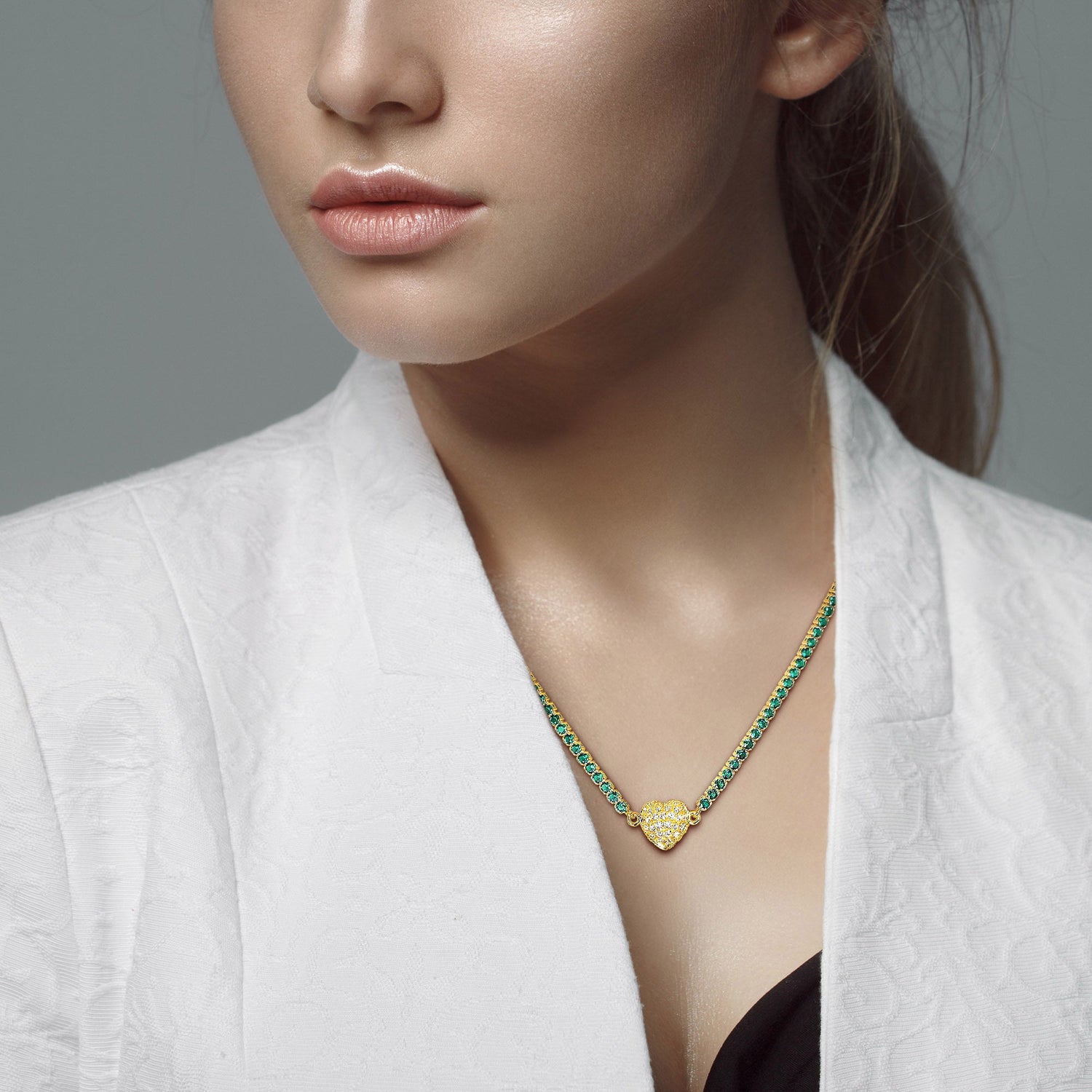 The Mimi & Max 13 5/8ct Created Emerald & White Sapphire Heart Necklace brings romance and color to life. Set in yellow silver, this heart-shaped pendant glistens with vibrant green and clear stones, adding elegance to any outfit.