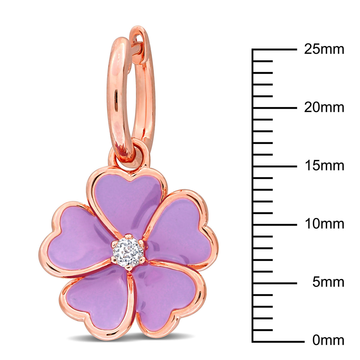 Crafted in rose-plated sterling silver with 1/6ct total gem weight white topaz accents and purple enamel flower detailing. Hoop-style earrings.