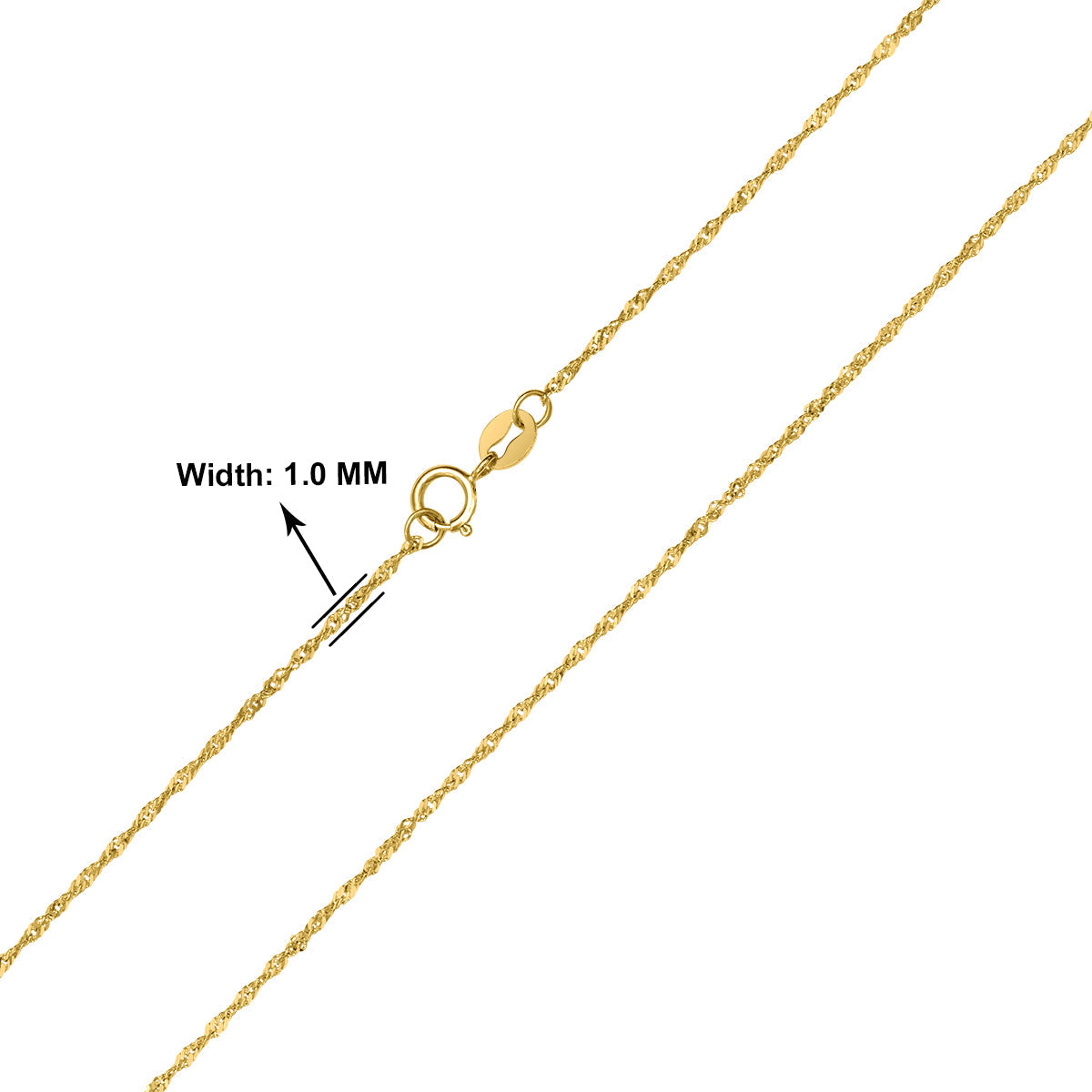 Made with 10K yellow gold, 1mm thickness, 16-inch length, with a spring ring clasp.