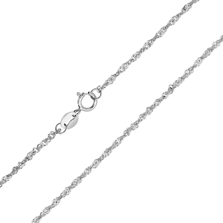 This 10K White Gold 1.5mm Singapore Rope Chain by SSELECTS is beautifully crafted for elegance and durability, ideal for showcasing pendants or worn alone. The delicate twist adds refined texture and shine.