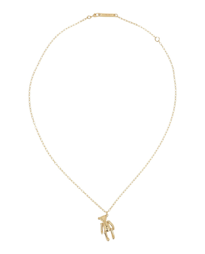 This Teddy Bear Charm Necklace by AMBUSH captures the essence of nostalgia with a luxe streetwear twist. A playful teddy bear charm with gold-tone hardware and engraved detailing hangs from a bold sterling silver chain. It’s a whimsical piece with artistic attitude, perfect for layering or standing out on its own.