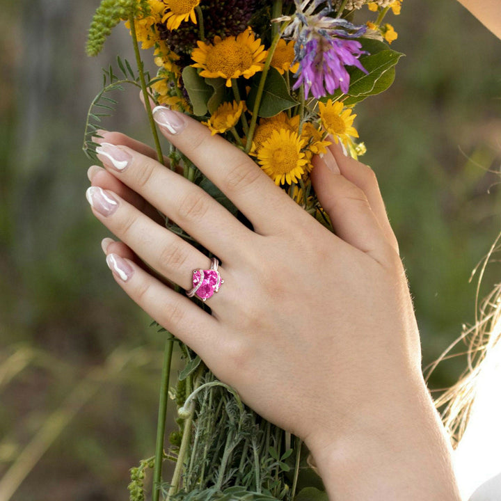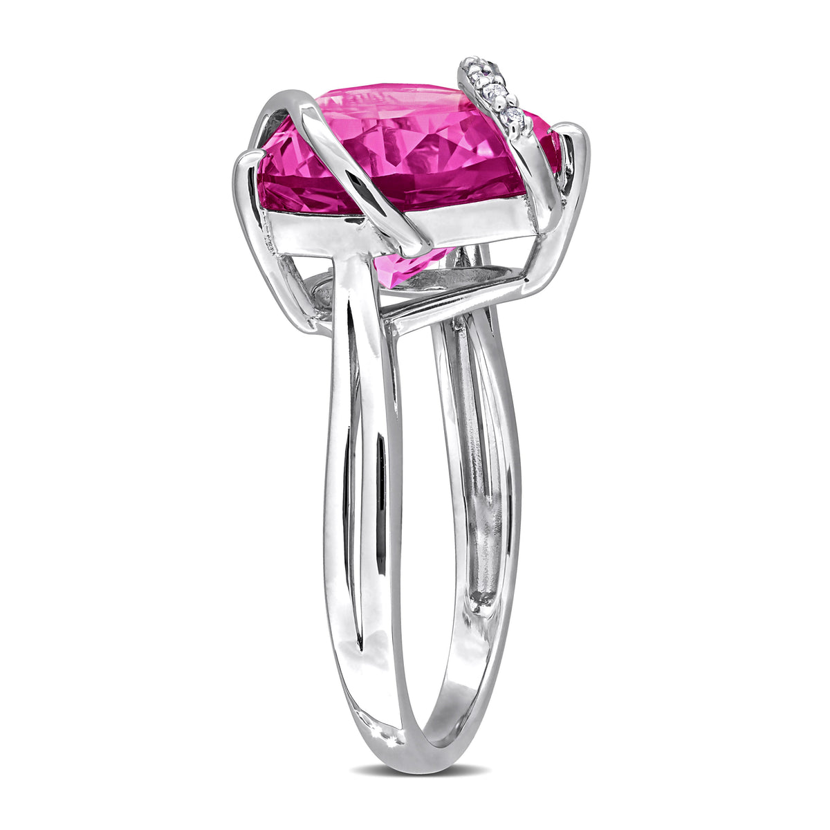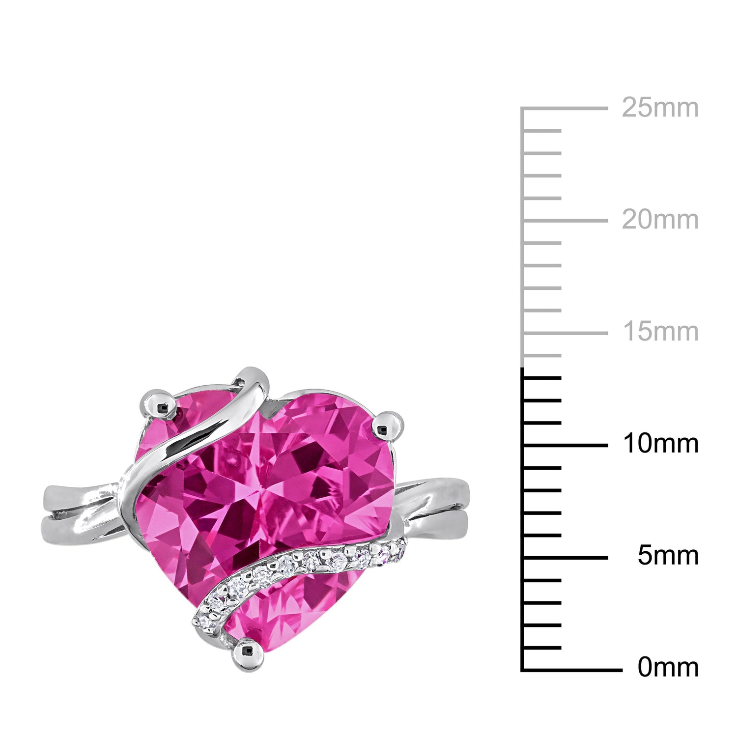 Crafted in sterling silver with 7 1/4 carats total weight of created pink sapphires and diamond accents in a heart-wrapped design.
