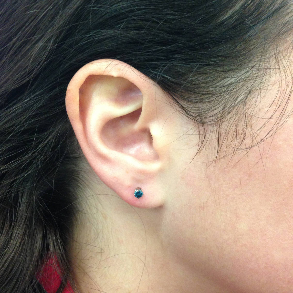 Solid 14K yellow gold with two round brilliant cut blue color-enhanced diamonds (I2-I3 clarity), totaling 1/3ct. Secured with push backs.