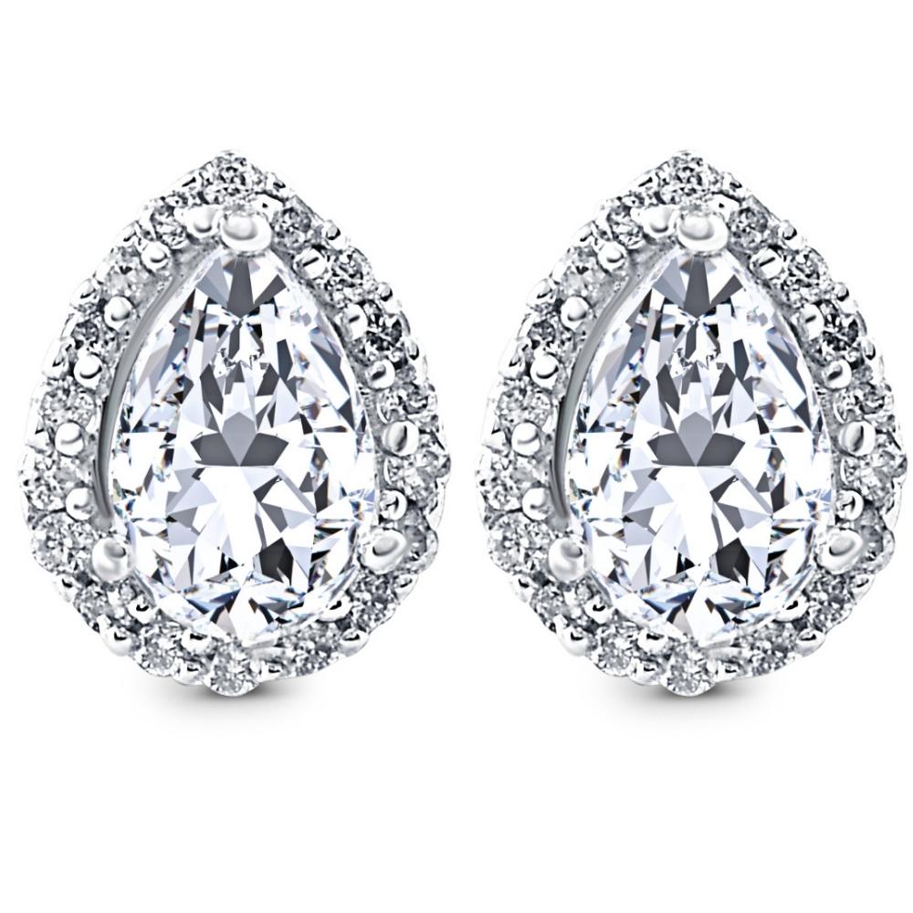 Crafted in solid 10k white gold with two 1/5ct pear-shaped natural diamonds and round accent halo diamonds. Secured with screw backs. Available in white or yellow gold.