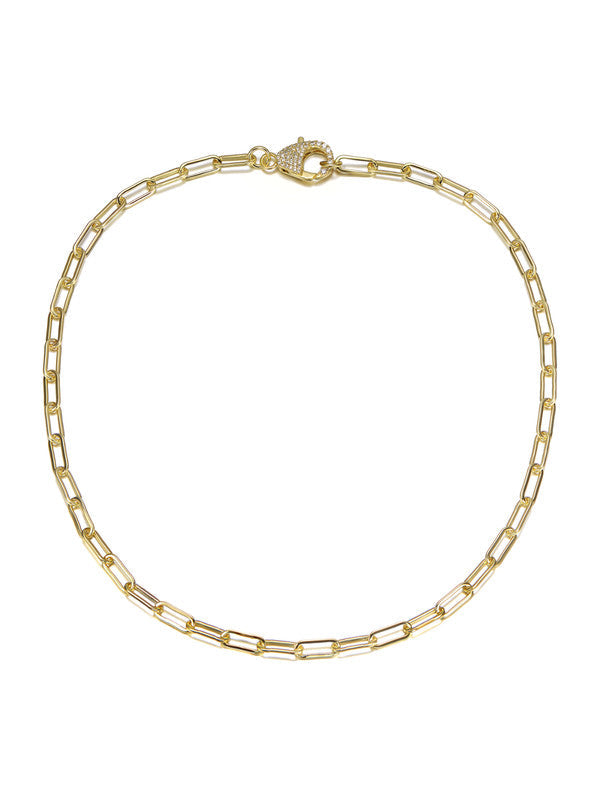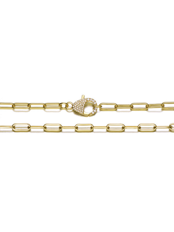 14k Gold Plated with Clear Cubic Zirconia Pave Clasp Paperclip Link Necklace