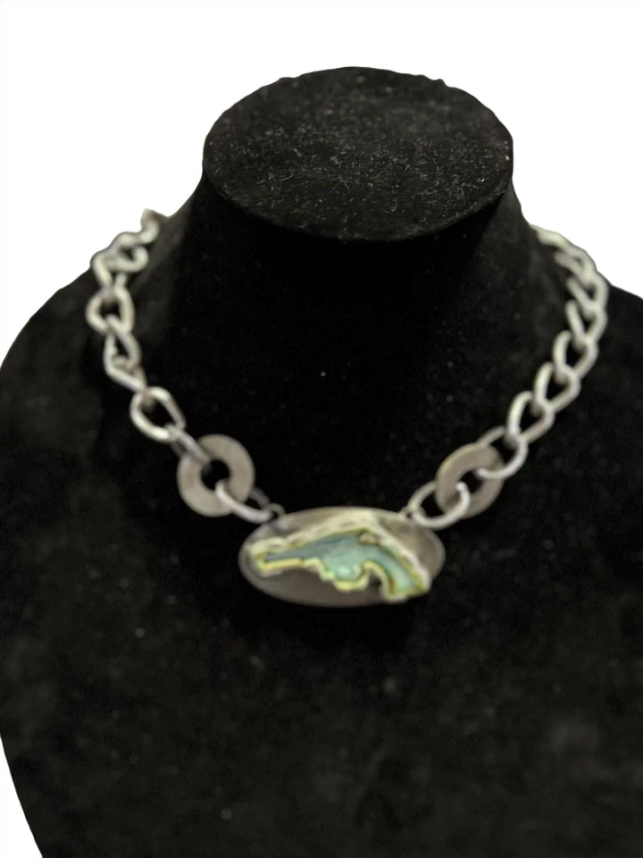 This Small Necklace in Silver/Turquoise/Green by Art By Amy Labbe features vibrant colors and an artistic design, making it a unique and playful statement piece. Perfect for those who love to express their individuality through their fashion choices.