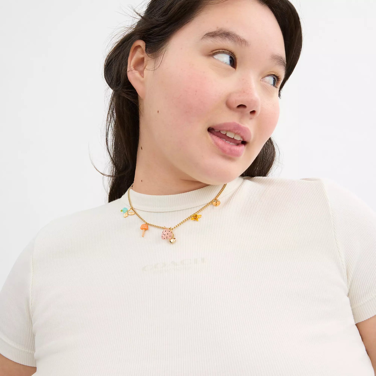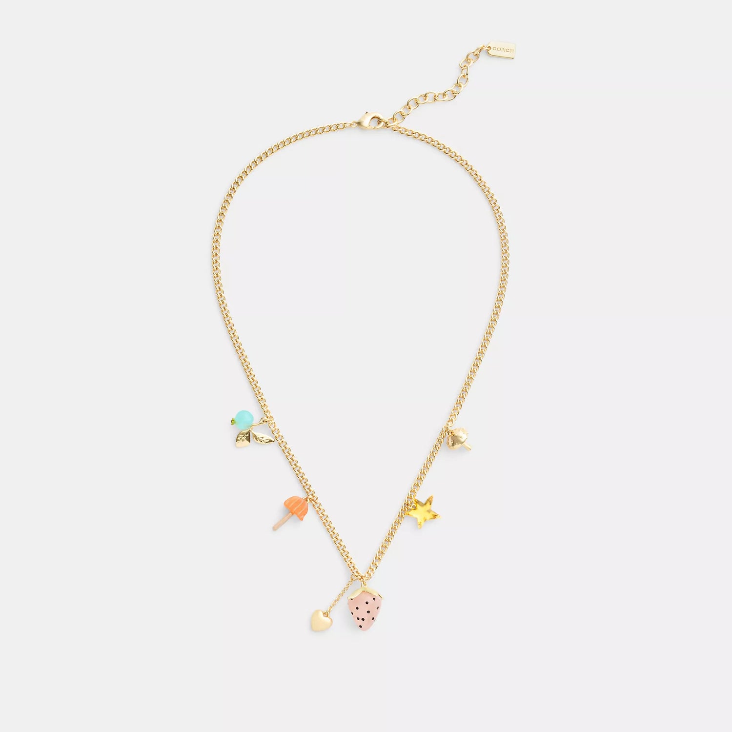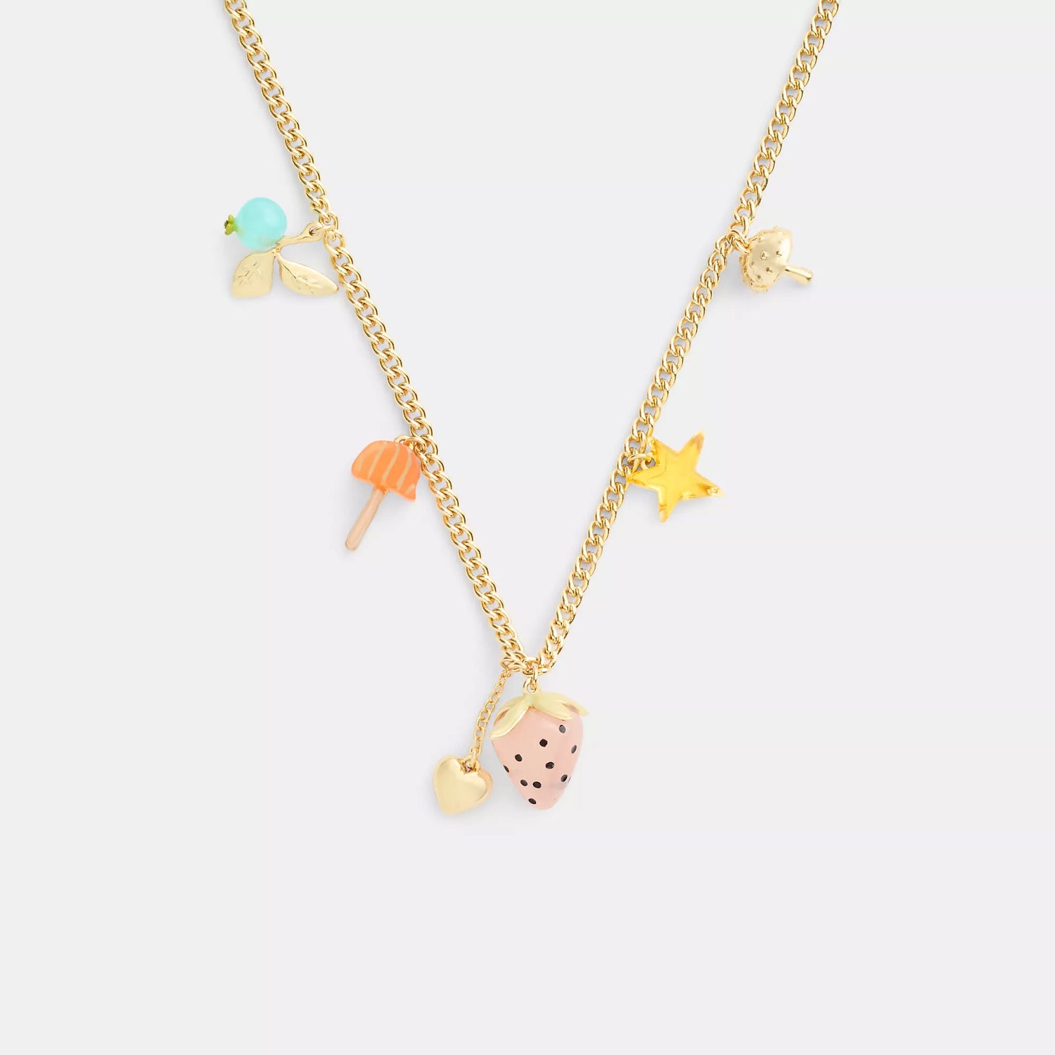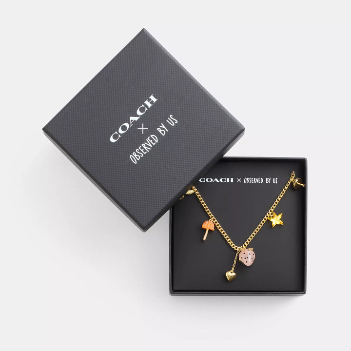 This Coach X Observed By Us Strawberry Heart Charm Necklace by Coach is a delightful and playful piece from the collaboration between Coach and Observed By Us. The necklace features colorful resin charms in the shape of a strawberry heart, leaf, mushroom, and star, all suspended from a plated brass chain. The whimsical design captures the joy of everyday life with its charming illustrations, creating a fun and fashionable statement piece. Perfect for those who appreciate imaginative, limited-edition jewelry that tells a story.