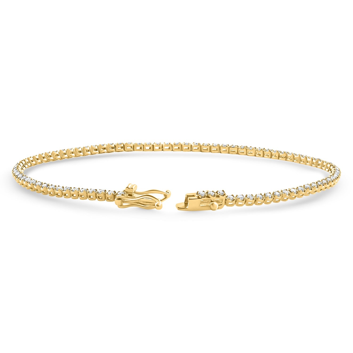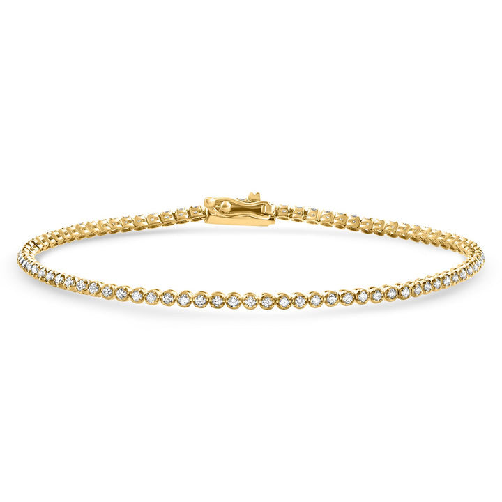 Made with 84 round brilliant-cut natural diamonds, totaling 1 carat. Prong set in solid 14K yellow gold. Double locking clasp closure.