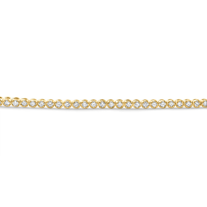 This 14K Yellow Gold 1Ct TW Natural Diamond Tennis Line Bracelet by Pompeii3 features 84 round brilliant-cut natural diamonds, prong set in solid 14K yellow gold. This classic bracelet is ideal for both everyday wear and special occasions, adding elegance and shine to any look. The secure double locking clasp ensures the bracelet stays in place.