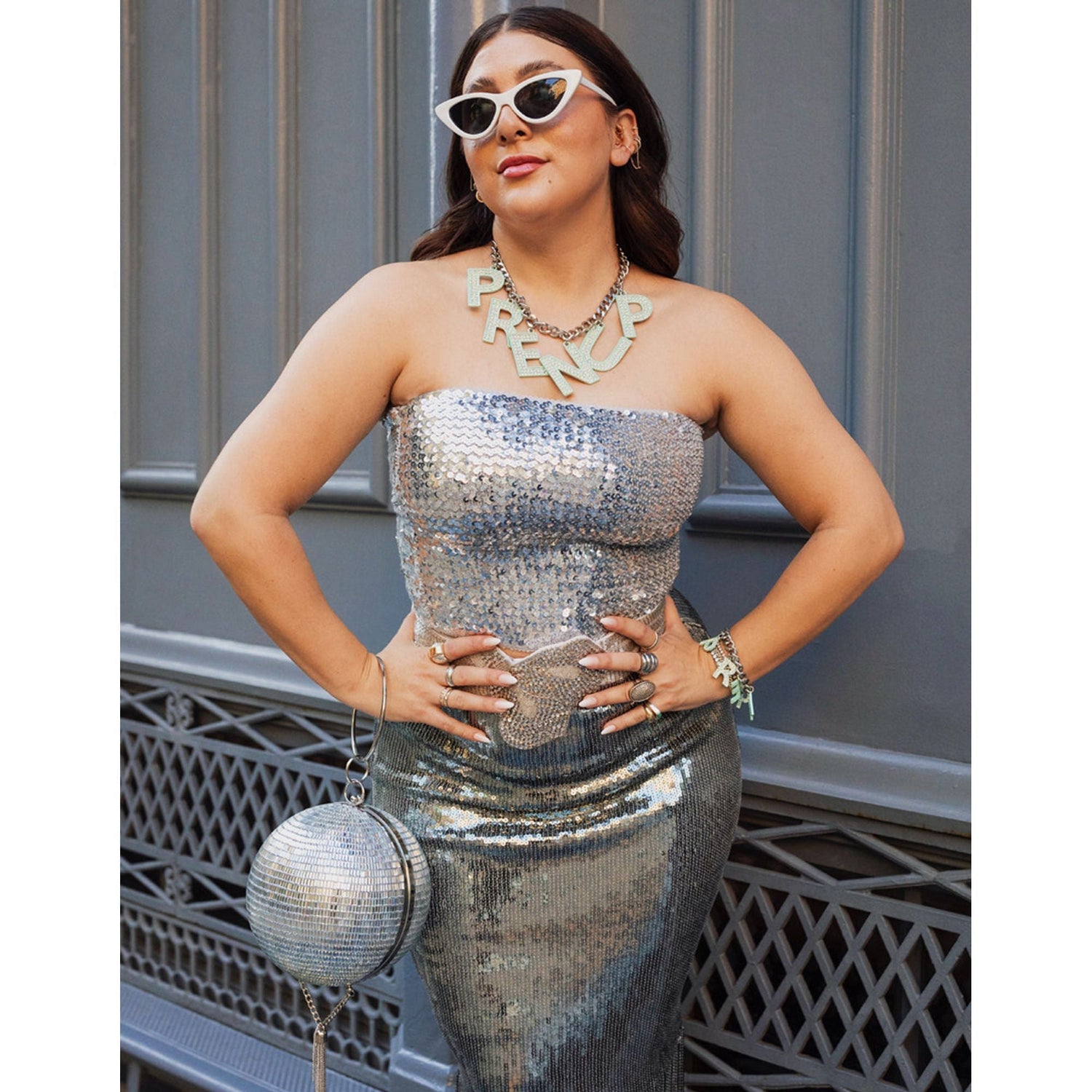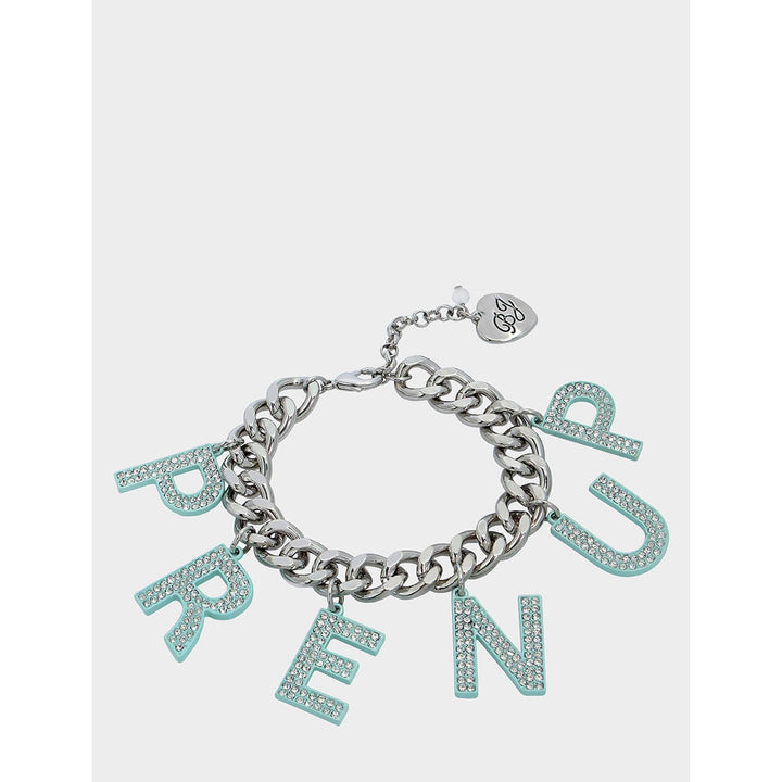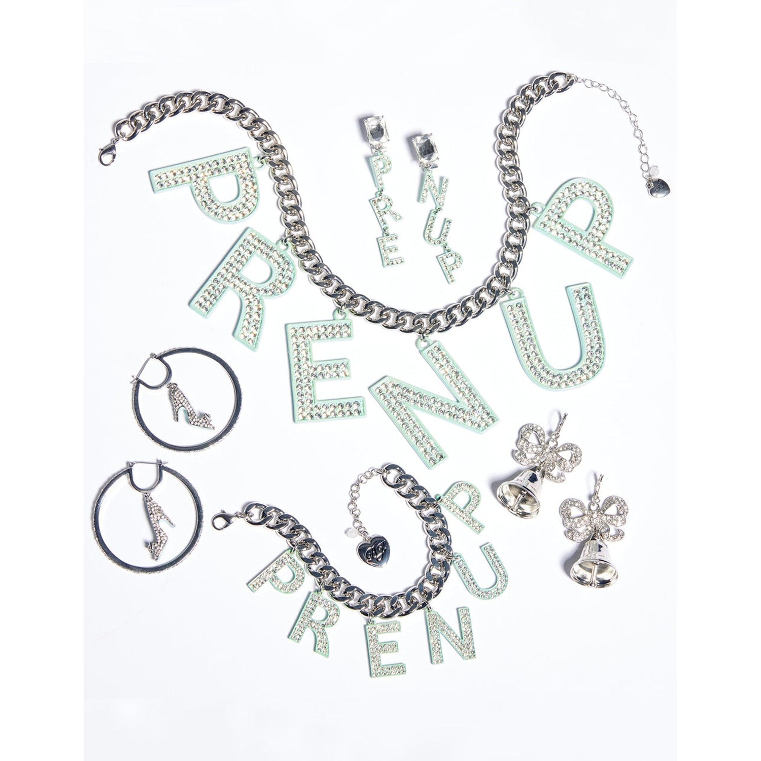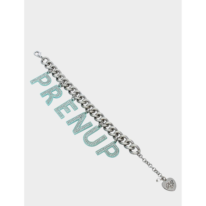 This Prenup Charm Bracelet Crystal by Betsey Johnson is a fun, bold piece that combines whimsy with elegance. The bracelet features curb chain links and dangling “PRENUP” charms, each adorned with sparkling glass crystals. This piece makes for a memorable and playful addition to any jewelry collection.