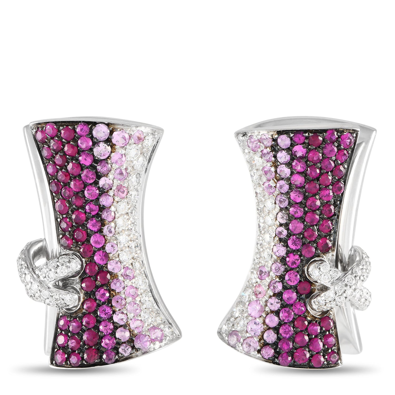 These Stefan Hafner 18K White Gold 0.95ct Diamond and Pink Sapphire Earrings embody Italian sophistication. The earrings feature pave-set white diamonds and gradient pink sapphires, creating a stunning silhouette. The omega back clasp ensures a secure and comfortable fit.