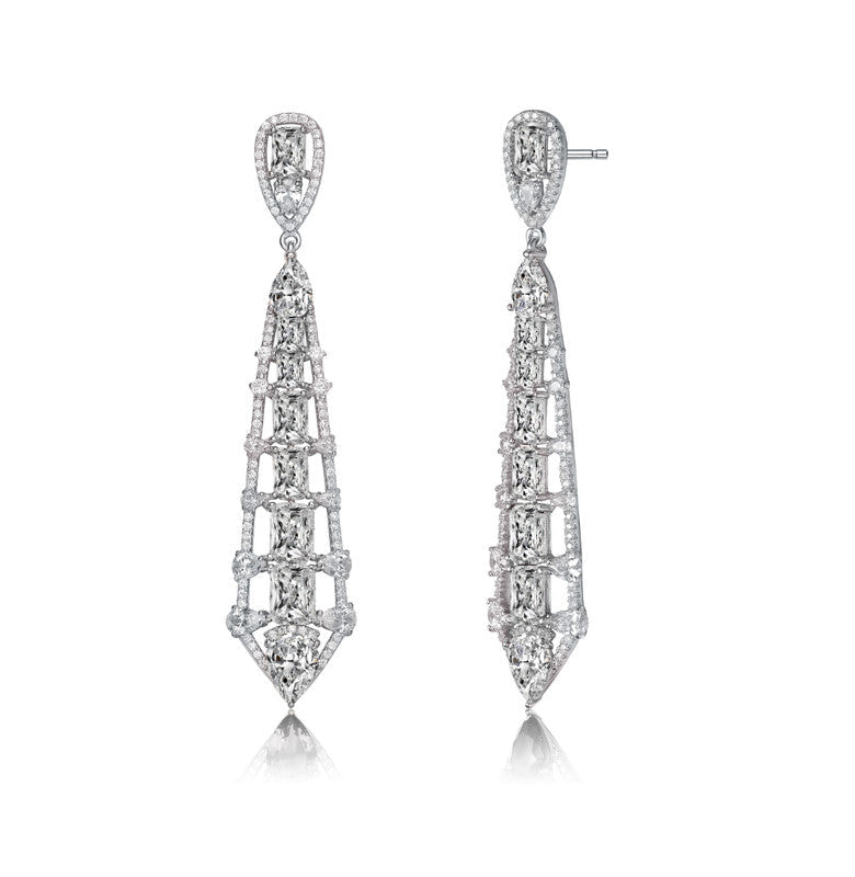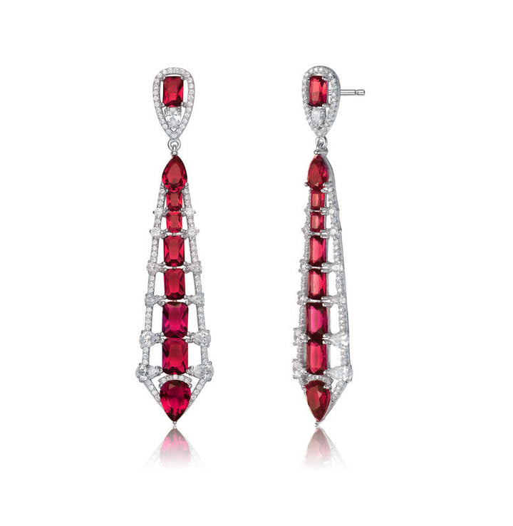 These Sterling Silver with Colored Cubic Zirconia Ladder Style Dangle Earrings bring a modern touch with their ladder-style design. Each level is paved with sparkling white cubic zirconia, while colored cubic zirconia stones (emerald green, ruby red, or sapphire blue) add a pop of color. Available in white gold or 18k rose gold plating, these earrings are a statement of style and sophistication.
