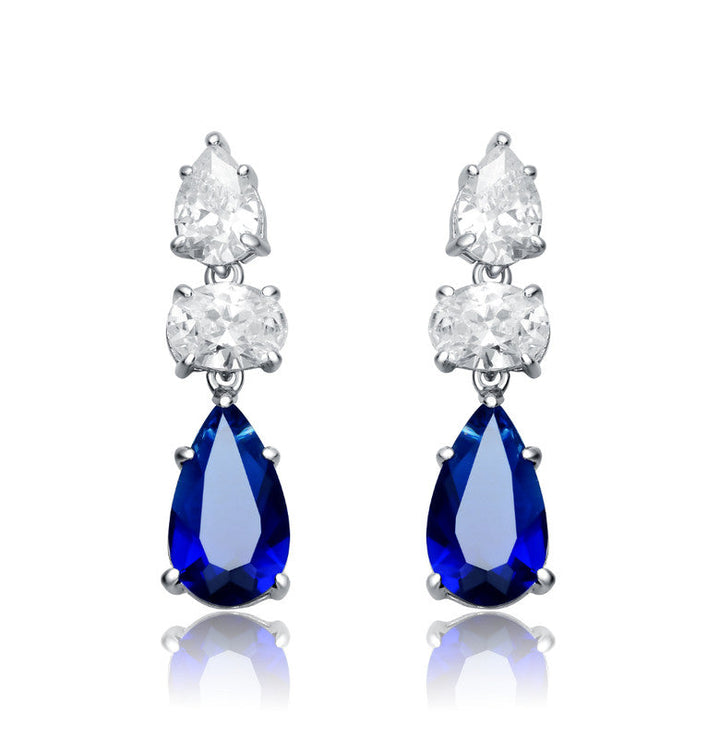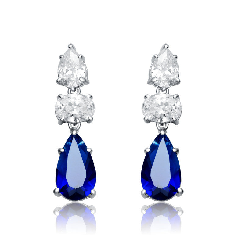 Sterling Silver Rhodium Plated With Blue Pear And Clear Oval Cubic Zirconia Drop Earrings