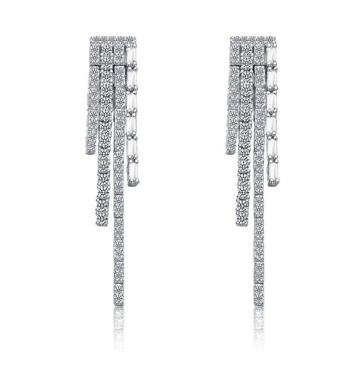 Sterling Silver White Gold Plated With Cubic Zirconia Graduated Fringe Dangle Earrings
