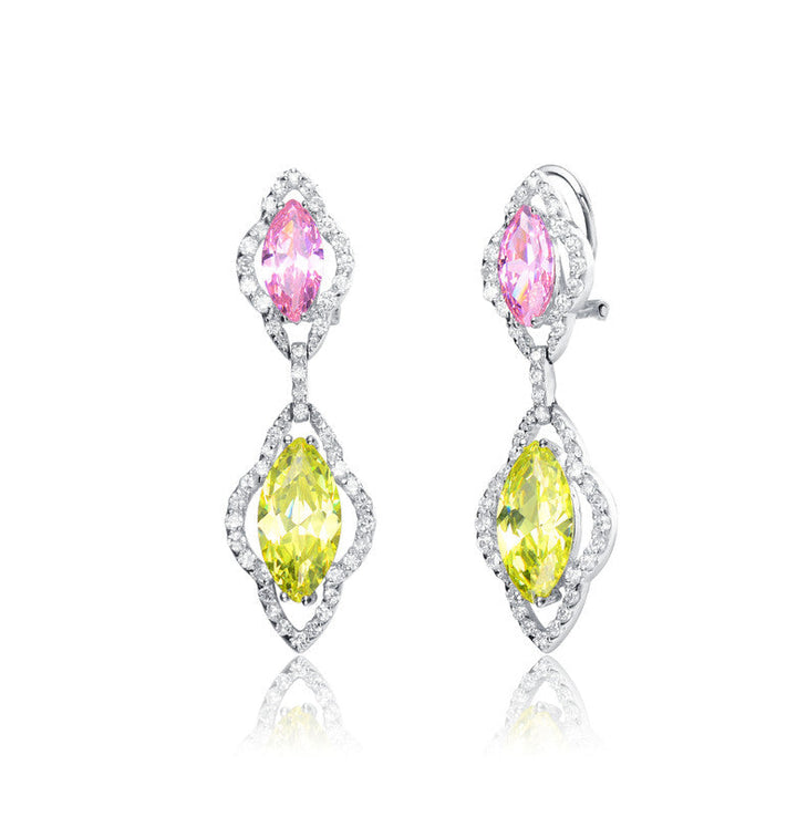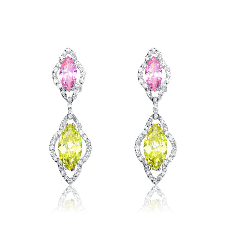 Crafted from sterling silver with rhodium plating, featuring marquise and round cubic zirconia stones in pink, yellow, and clear hues. Omega clasp closure.