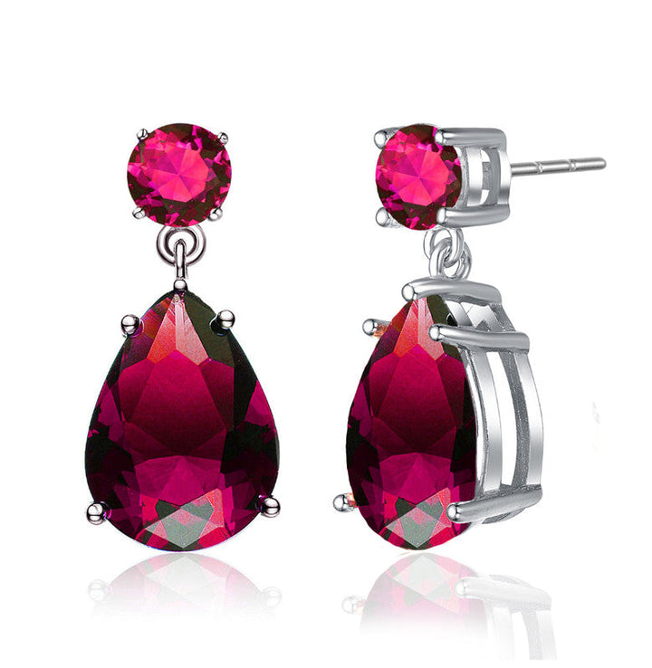 Made of sterling silver with white gold plating, featuring colored cubic zirconia stones in pear and round shapes. The earrings are secured with butterfly clasps for a secure fit.