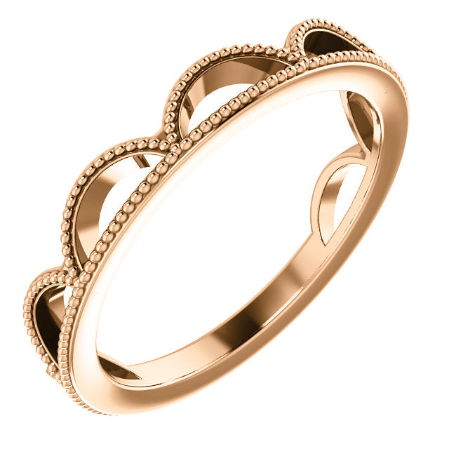 Crafted from solid 14K rose gold, with a 4mm band width. The crown design extends three-quarters of the way around the band.