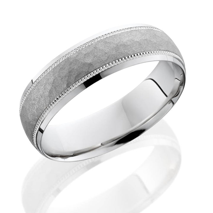 This Hammered Wedding Band 14K White Gold by Pompeii3 features a brushed hammered center with milgrain detailing on the edges, giving the ring a distinctive and refined look. The beveled edges add a modern touch, while the solid 14K white gold ensures durability and timeless elegance. Ideal for those seeking comfort and style, the rounded inside edges provide a perfect fit.