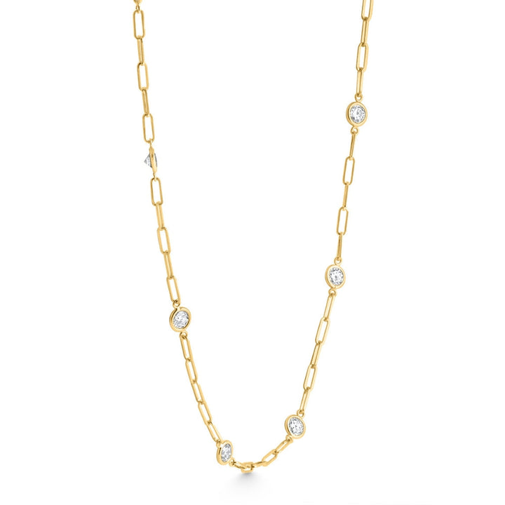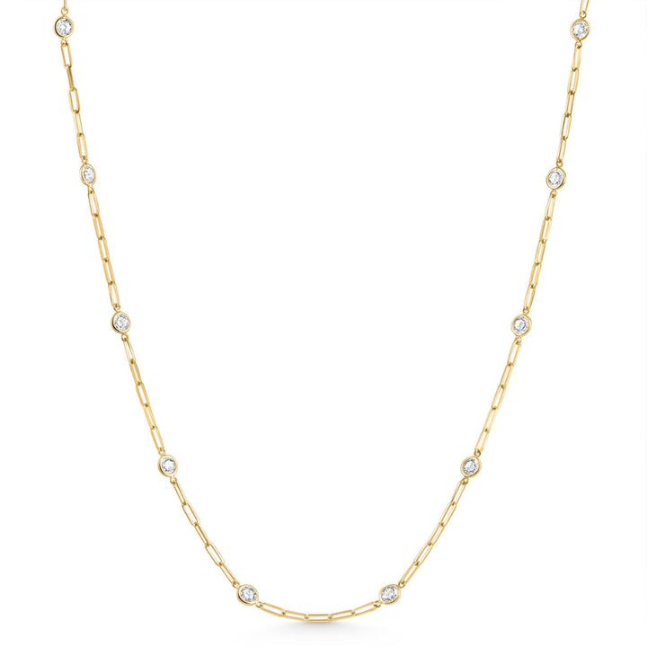 This 4ct Diamond 14K Yellow Gold 18' Paper Clip Diamonds By Yard Necklace Lab Grown by Pompeii3 features 12 round brilliant cut lab-grown diamonds, set in a bezel-style paper clip chain. This necklace is designed for stacking or wearing solo.
