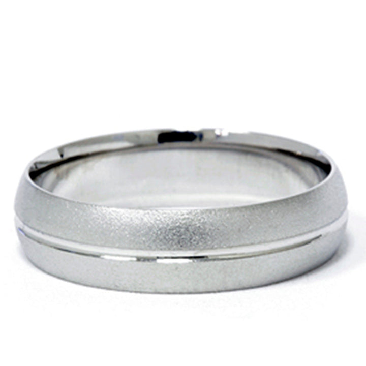 Handcrafted in 950 platinum. Carved convex center with sandblast finish. 6mm width. Comfort fit.