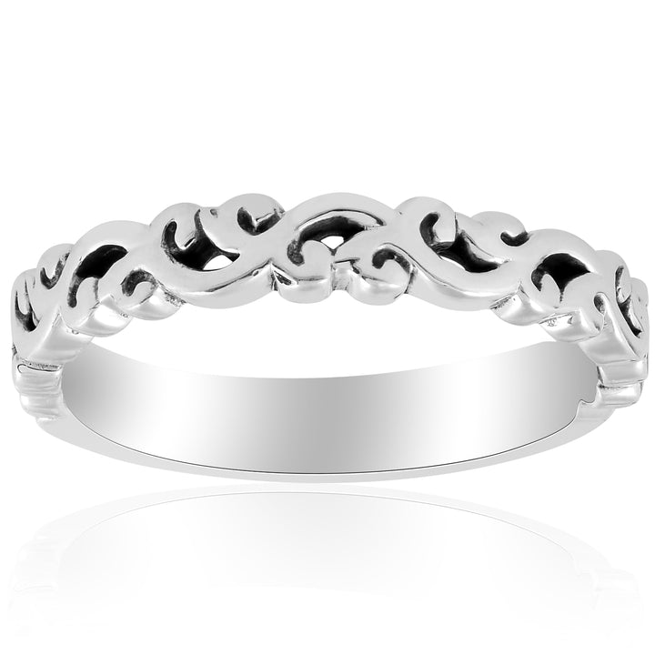 14k White Gold Hand Carved Womens Wedding Band Filigree Vintage Stackable Ring