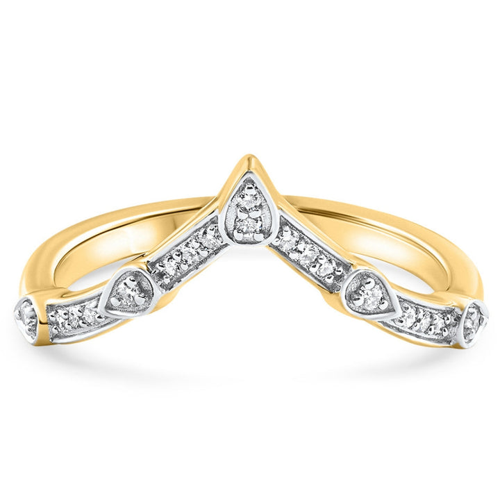 This Curved V Shape Diamond Wedding Anniversary Guard Engagement Ring by Pompeii3 is a stunning stackable piece designed to complement an engagement ring. It features 18 round-cut lab-grown diamonds, all prong set in solid 14k yellow gold. This v-shaped guard ring adds a touch of brilliance and sophistication to any set, making it a perfect addition for anniversaries or celebrations.