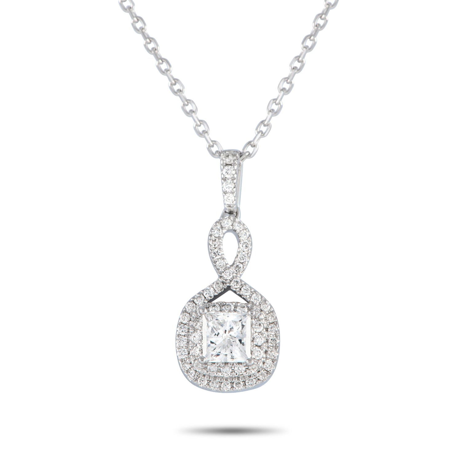 Crafted from 14K white gold, featuring 0.50ct total diamond weight. Pendant measures 0.75' long by 0.45' wide and hangs from an 18-inch chain with a lobster clasp closure.