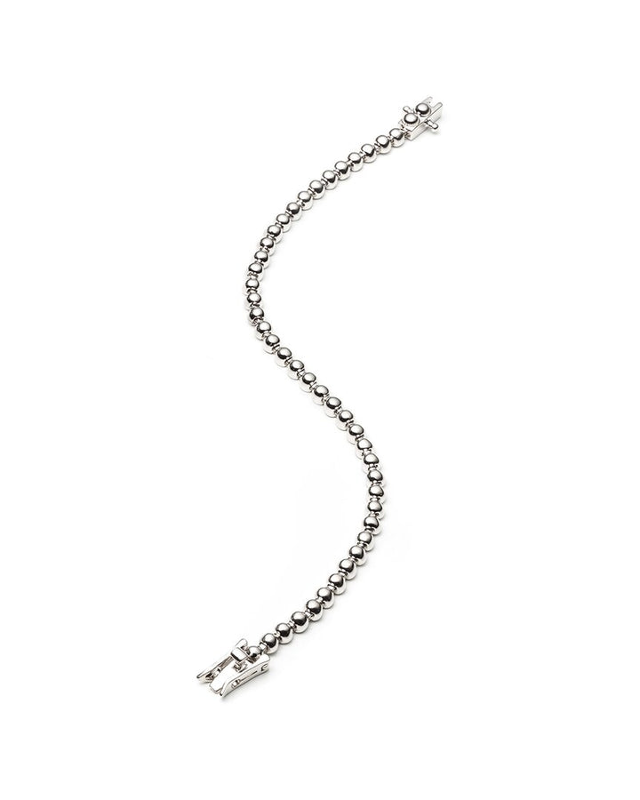 This sleek and modern tennis bracelet is crafted from rhodium-plated brass, featuring a dome design that catches the light with every movement. It’s a statement piece that pairs well with both casual and formal looks.